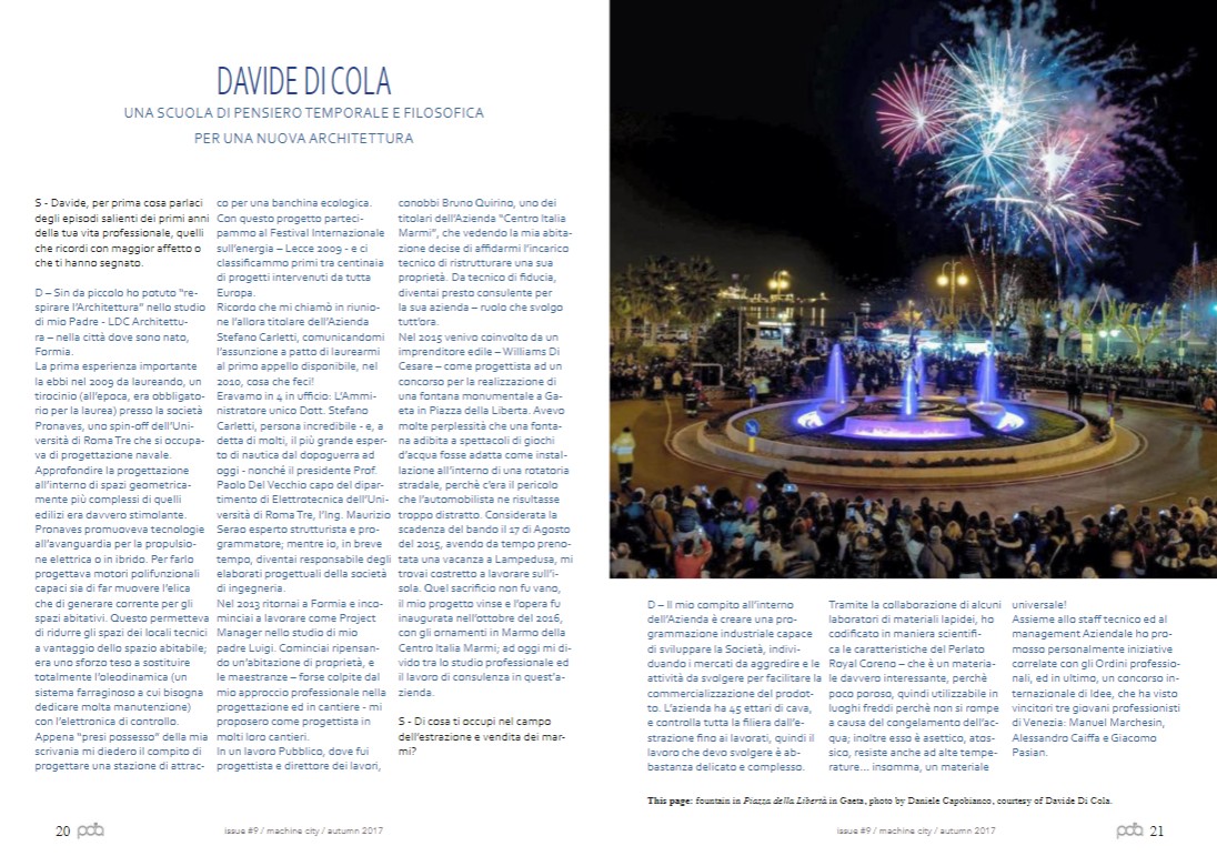 Nel 2015 venivo coinvolto da un imprenditore edile – Williams Di Cesare – come progettista ad un concorso per la realizzazione di una fontana monumentale a Gaeta in Piazza della Liberta. Avevo molte perplessità che una fontana adibita a spettacoli danzanti fosse adatta ad un installazione all’interno di una rotatoria stradale, fotografavo il conflitto che l’automobilista doveva vivere percorrendo la strada: guardare il suo percorso o l’opera monumentale con i suoi getti? Nonostante queste miei iniziali perplessità decisi di accettare lo stesso l’incarico. Considerata la scadenza del bando il 17 di Agosto del 2015, avendo da tempo prenotata una vacanza a Lampedusa, mi trovai costretto a lavorare sull’isola. Quel sacrificio non fu vano, il mio progetto vinse fra molti e l’opera fu inaugurata nell’ottobre del 2016 facendo realizzare gli ornamenti in Marmo alla Centro Italia Marmi.