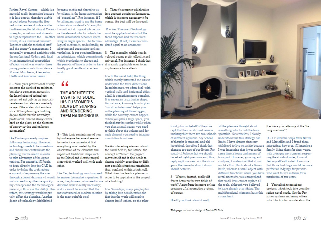 D – La contemporaneità impone di seguire la tecnologia. La tecnologia però deve essere un mezzo che non deve contaminare la progettazione, ma risultare utile per sfruttare le opportunità che ci si offrono. Per esempio, se iniziassi a disegnare direttamente in cad per definire una Architettura – anziché codificare l’idea con un disegno a matita – non riuscirei a sintetizzare in maniera rapida i miei concetti ed il mezzo tecnologico – in questo caso il CAD – mi condizionerebbe in maniera negativa la progettazione. Come ben evidente in questo caso, la tecnologia non utilizzata nei giusti tempi potrebbe inaridire un progetto anziché enfatizzarlo. Un altro inganno sulla tecnologia, esasperato dalle pubblicità e trasmesso a noi tecnici dai clienti, è definito dalla domotica “a prescindere”. Ogni tecnologia ha il suo utilizzo, ad esempio, se volessi utilizzare a tutti i costi la domotica all’interno di un appartamento di 50mq, non farei bene il mio mestiere, in quanto, ciò che controlla la domotica diventa interessante in “spazi più ampi”. Con questi esempi, mi piacerebbe affermare che: il mezzo tecnologico è senz’altro uno strumento da adottare e proporre, ma sta alla nostra intelligenza di tecnici comprendere quali tipologie scegliere ed i tempi per farne buon uso al fine di avere vantaggi sulla realizzazione finale di un’opera.